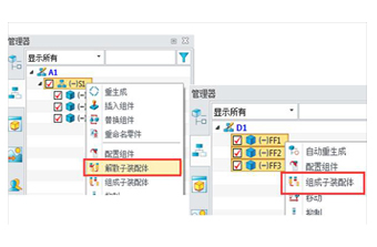 Anda dapat membongkar dan menyeret komponen sub-perakitan, mengubah komponen menjadi sub-perakitan, atau menyimpan sub-perakitan sebagai file baru atau objek baru.